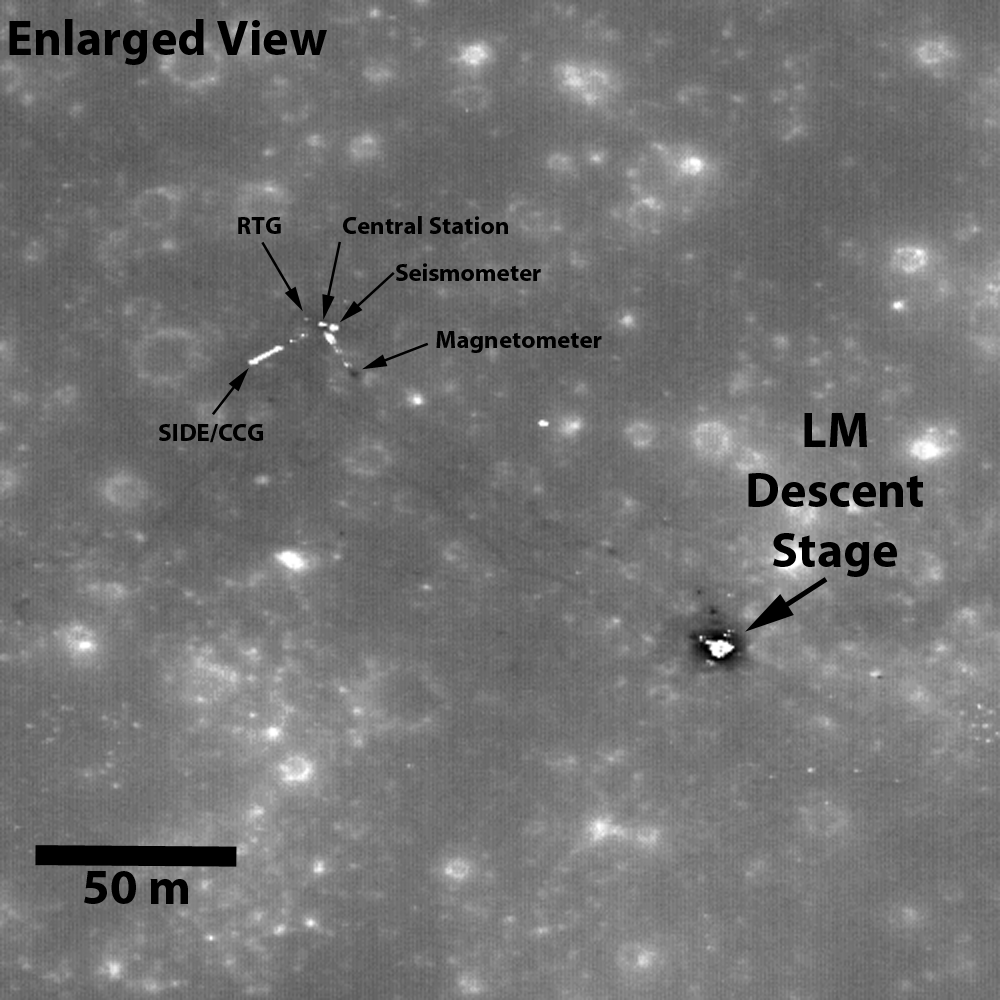 Enlarged view showing details of the Apollo 12 landing site. In the upper left, you can see the Apollo Lunar Surface Experiments Package, or ALSEP. The positions of the ALSEP central station, seismometer, Radioisotope Thermoelectric Generator (RTG), magnetometer, Suprathermal Ion Detector Experiment (SIDE), and Cold Cathode Gauge (CCG) have been highlighted [NASA/GSFC/Arizona State University].