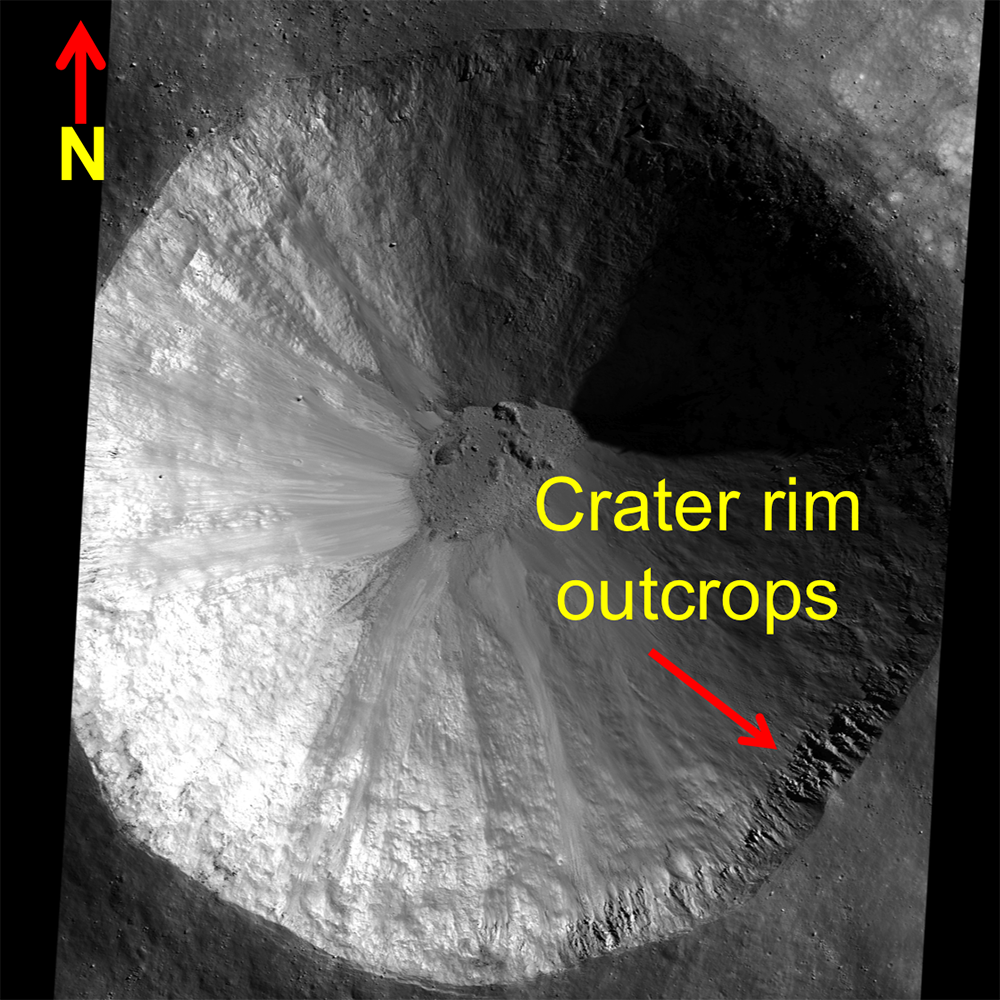 Explore the full resolution NAC mosaic of crater Piazzi H. The shadows cast by the textured crater wall make this crater a particularly beautiful one.
